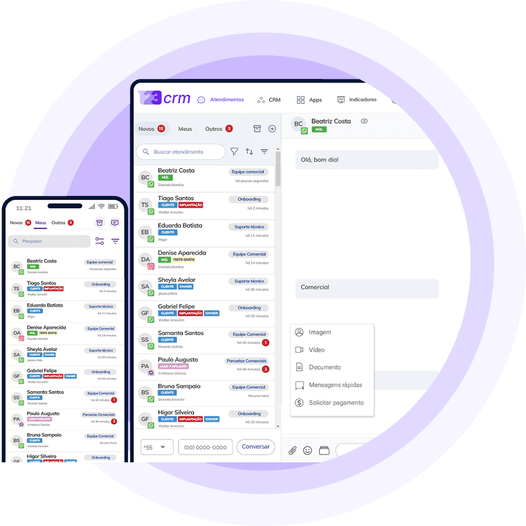 Conecte suas equipes com clientes e leads através de uma plataforma integrada ao WhatsApp, Instagram Direct e Facebook Messenger